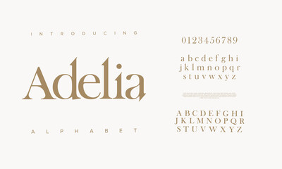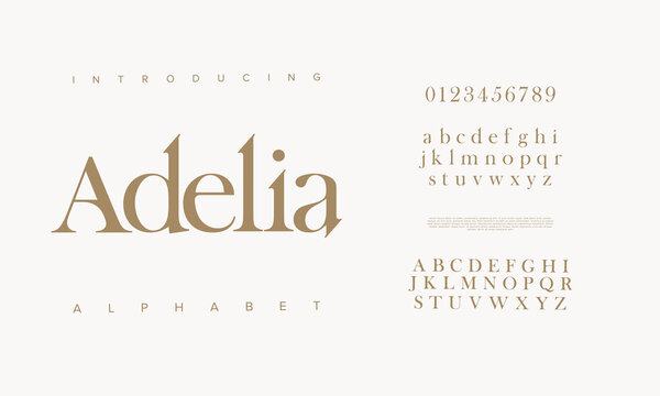 Adelia premium luxury elegant alphabet letters and numbers. Elegant wedding typography classic serif font decorative vintage retro. Creative vector illustration