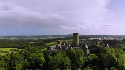Nürburg castle on a shallow depth of field landscape. It stands within the famous North Loop, or Nordschleife, of the Nürburgring racing course at an altitude of 678m on a volcanic basalt cone.