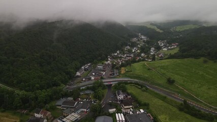 Adenau Germany, Race track aerial drone view in the Eifel on a cloudy day.