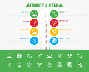 Adenoiditis and adenoma infographics with thin line icons. Benign tumor, hearing loss, adenoid face, adenomatous polyp, prolactinoma, hormones, radiation therapy, ultrasound scan. Vector illustration.