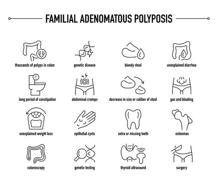 Familial Adenomatous Polyposis symptoms, diagnostic and treatment vector icon set. Line editable medical icons.