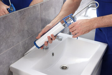 master of interior decoration, smears the joint of the tile and the kitchen countertop with white silicone instead of the skirting board, close-up