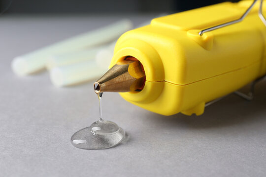 Melted glue dripping out of hot gun nozzle on grey background, closeup