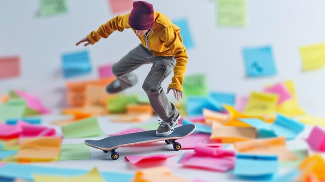 This image captures a skateboarder in mid-air performing tricks against a backdrop of vibrant sticky notes, highlighting the blend of street culture with colorful, creative elements.