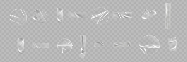 Realistic transparent tape. Plastic glue scotch strip for fix, clear adhesive sticker crumpled cellophane bandage sticky strips, realistic duct tapes