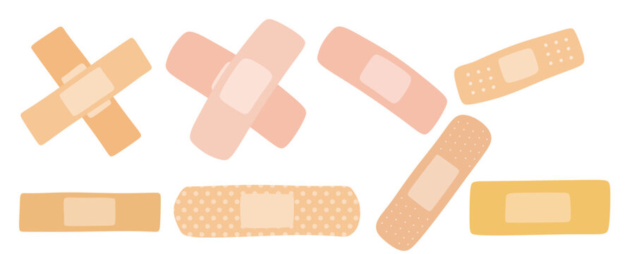 Set of different medical plasters. Collection of adhesive bandage for first aid. Pharmacy plaster. Health care. Vector illustration of medical patches isolated on white background. Protection of inju