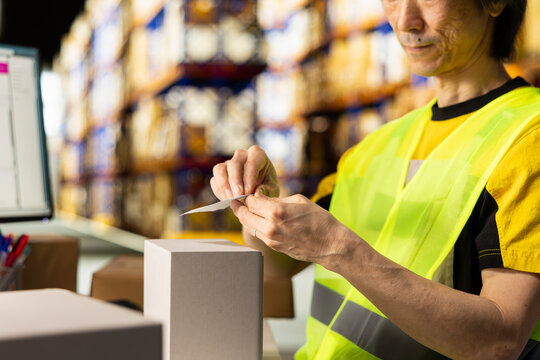 Close up of woman preparing boxes for online delivery
