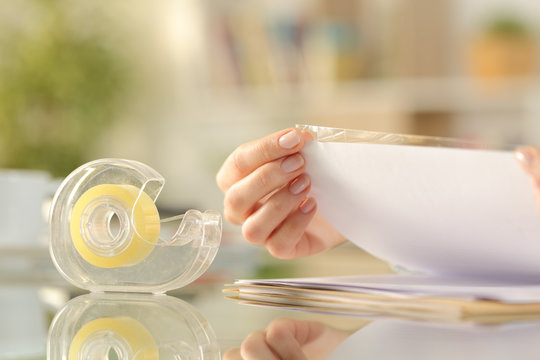 Woman hands sticking adhesive tape on a paper