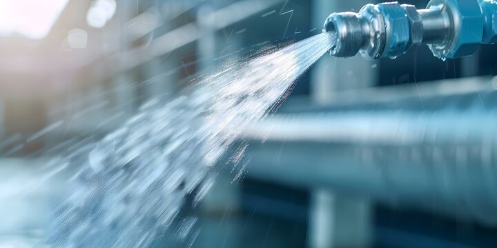 Closeup of adiabatic city cooling system nozzle spraying water for heat reduction. Concept Urban Sustainability, Cooling Technology, Adiabatic Systems, Water Conservation