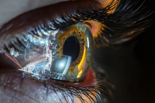 Human Cyborg AI Eye diabetic retinopathy. Eye visual impairment optic nerve lens brown color vision. Visionary iris adies pupil sight envisioning eyelashes