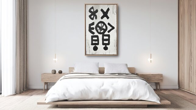 Monochromatic Adinkra symbol canvas in oak frame above a platform bed, blending Scandinavian and African design elements in warm bedroom lighting.