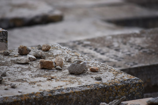 Detalle de piedras y oraciones en tumbas de un cementerio judío, Jerusalén, Israel, Oriente medio.