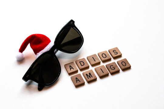 Adios Amigo wood block letters. A pair of folded black wayfarer-style sunglasses with a small Santa red-white Christmas hat on white. Holiday-themed, Christmas in July stock image. Vacation.