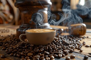 Warm coffee cup on a table with coffee beans beside a vintage grinder. Cozy ambiance. Perfect for cafes, restaurants, coffee blogs or backgrounds. High resolution, rustic style photo. Generative AI