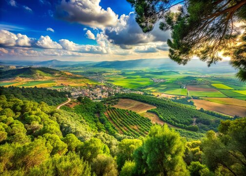 Panoramic View of Kibbutz Sasa, Upper Galilee, Israel: Lush Forest, Fields, and Adir Mountain Scenery