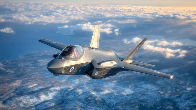 An Israeli F-I Adir flying silently above the clouds with precision, the curvature of the Earth barely visible beyond the wing tips and a glowing atmosphere framing the high-tech