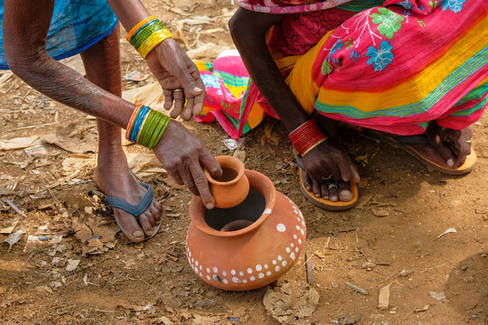 Kunduli, India - February 2021: Adivasi women from the Kondh tribe shopping for clay vases in the Kunduli market on February 19, 2021 in Odisha, India.