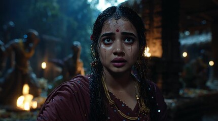 Sorrowful woman, South Indian tribal in her 30s, fair skin with clear face, no injuries, kneeling in front of a glowing idol of Goddess Parvati.