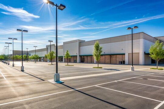 A serene and deserted parking area adjacent to a large retail store building with rows of empty spaces and a few lampposts on a sunny day.