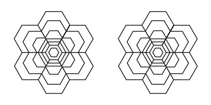 Abstract icon set with interlocking hexagonal patterns on a white background. Abstract, adjacent icon. Line, outline symbol. Abstract Digital background. Business growth transformation to digital.