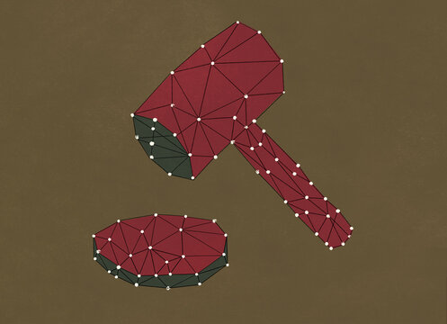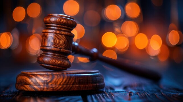 Gavel of Justice: A judge's gavel rests on its block, reflecting the dramatic, fiery background. The image symbolizes justice, law, and legal proceedings.
