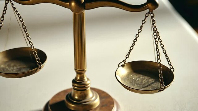 Age-old scales rest on a wooden surface, bathed in warm light. Balanced scales evoke notions of justice and fairness in a rustic setting. Symbolic representation of law stands prominent against a
