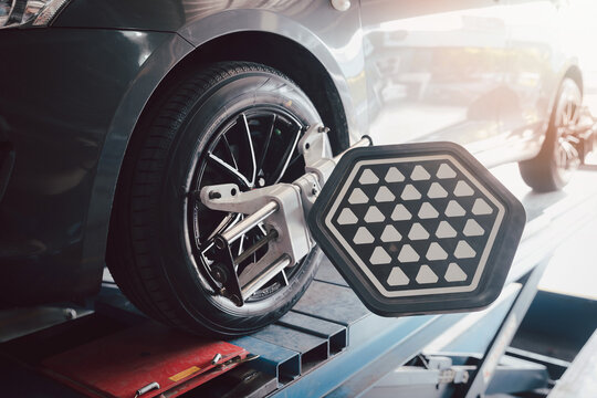 Car wheel balancer calibrate with laser reflector attach on each tire to center driving adjust. Car in auto service. Balancing tire wheel machine.