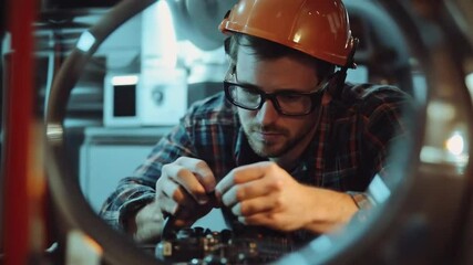 A man in an orange construction helmet and goggles is working with wires. He looks intently at the wires and uses a tool to adjust or repair them.