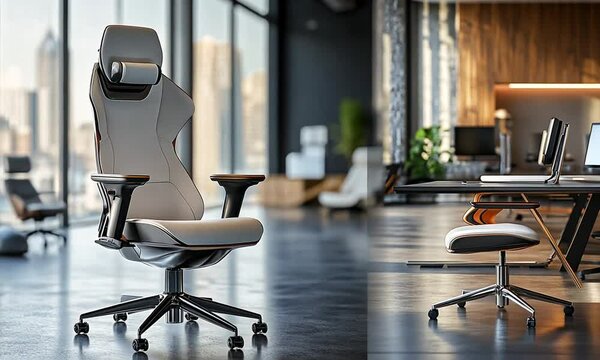 A modern office space featuring a stylish ergonomic chair and a sleek desk.
