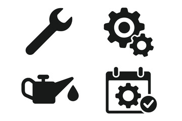 Maintenance service icon set. Wrench tool, gear mechanism, oil can, liquid drop, maintenance calendar, repair symbol, settings sign. Preventive engineering, periodic schedule vector illustration