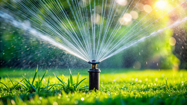 Automatic lawn sprinkler watering green grass. Sprinkler with automatic system. Garden irrigation system watering lawn. Water saving or water conservation from sprinkler system with adjustable head.
