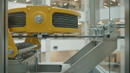 Mechanical pulley system in action showcasing cable movement and tension adjustments with visible components and engineering details in a modern setting