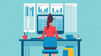 Filing cabinets with documents, laptop, facial recognition icon, professional at desk. Ideal for data storage, authentication, office workflow, organization security efficiency modern work. Simple