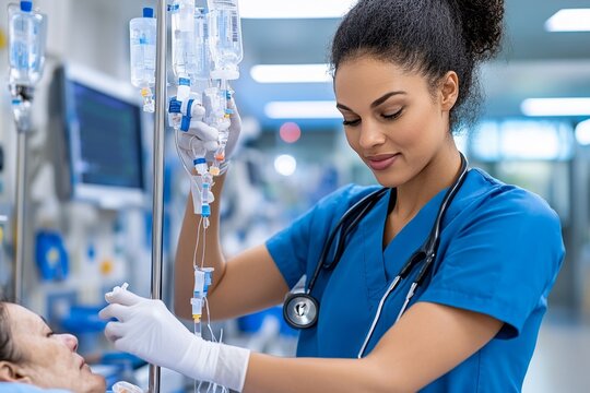 A nurse administering medication to a patient, using an IV drip in a hospital setting