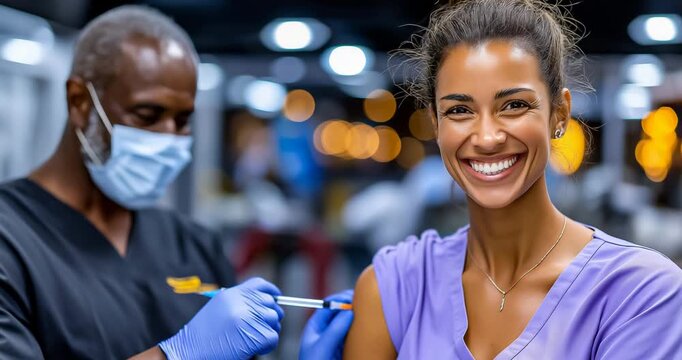 Nurse administering injection to patient with reassuring smile, clean clinic setting, focused lighting on interaction