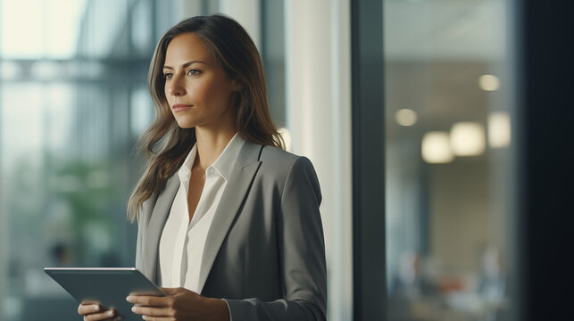 A professional scene featuring a serious female administrative manager in a formal suit walking in an office with a digital tablet