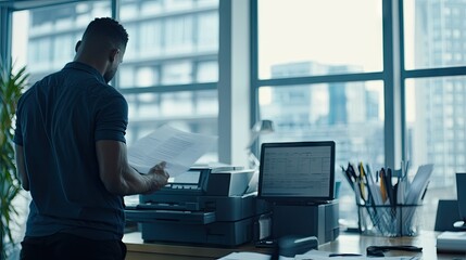 A focused office worker sits at a clean desk, examining papers beside a laptop. The scene conveys professionalism, productivity, and a modern, collaborative workspace.
