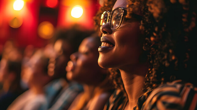 A Young Woman Gazing Upward with Hopeful Expression Under Stage Lights