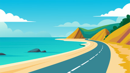 A scenic highway that leads to a secluded beach with white sand and turquoise waters that beckon travelers to stop and admire the view.