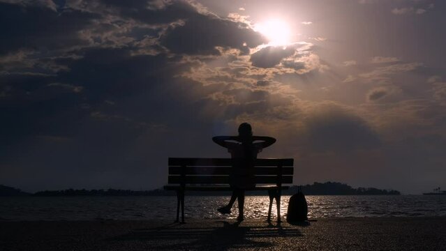 Teen leisure on bench by dusk sea. A view of resting teen girl silhouette on bench admire the waterfront during evening time.