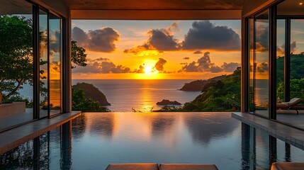Sunset serenity over ocean luxury villa scenic landscape tranquil view