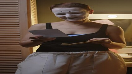 Zoom-in shot of happy adult mime actress wearing stage makeup looking through fans letters after concert, leaning on mirror table in backstage room with yellow dimmed light