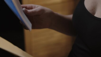 Tilt down shot of female mime artist smiling while reading fan letter in dressing room after theater performance
