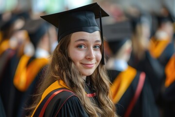Students celebrate receiving their diplomas at the graduation ceremony. A girl in a graduation hat looks at her fellow students against the backdrop of the university.