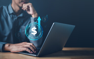 business, management, strategy, finance, graph, investment, marketing, currency, development, dollar. touching via finger at switch to boost your business and arrow up, near by there coin HUD.