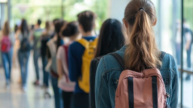A group of students gathers around in the college lobby, each one diligently waiting on their college applications.