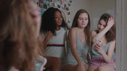 happy teenage girls taking selfie photos together using smartphone best friends posing enjoying making faces hanging out at home sharing weekend on social media