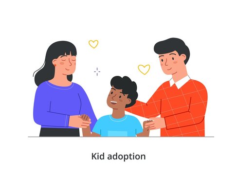 Kid adoption concept. Multinational foster couple holds hands with their adopted son. Happy little boy with his mother and father. Orphan has found new family. Cartoon flat vector illustration