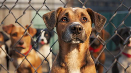 Unwanted and abandoned dogs of various breeds patiently waiting for adoption at an animal shelter
