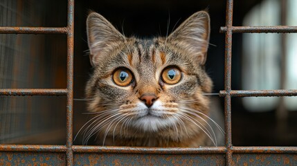 Sad tabby cat in metal cage